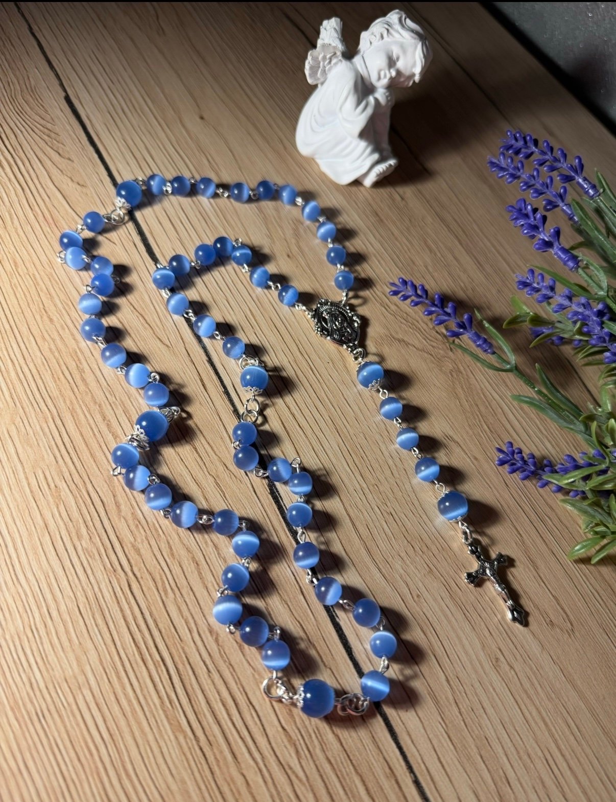 Šis elegantiškas, klasikinis baltas rožančius iš kalnų krištolo pagamintas iš balto kalnų krištolo karoliukų, kurių dydis – 8–10 mm. Taisyklingos struktūros, itin estetiškai atrodantis rožančius yra puikus pasirinkimas ieškantiems subtilios, šviesios ir kartu universaliai tinkančios religinės dovanos ar asmeninės maldos priemonės. Rožančius puoštas sidabro spalvos detalėmis. Dėl savo neutralaus atspalvio šis rožančius puikiai tinka tiek berniukui, tiek mergaitei, tiek vyrui ar moteriai – krikštui, pirmajai Komunijai, Sutvirtinimo sakramentui ar bet kuriai kitai svarbiai progai. Suvertas ant vinukų, todėl yra tvirtas, stabilus ir ilgaamžis. Rankų darbo, su meile kurtas gaminys kiekvienam, vertinančiam kokybę, grožį ir dvasinę reikšmę.