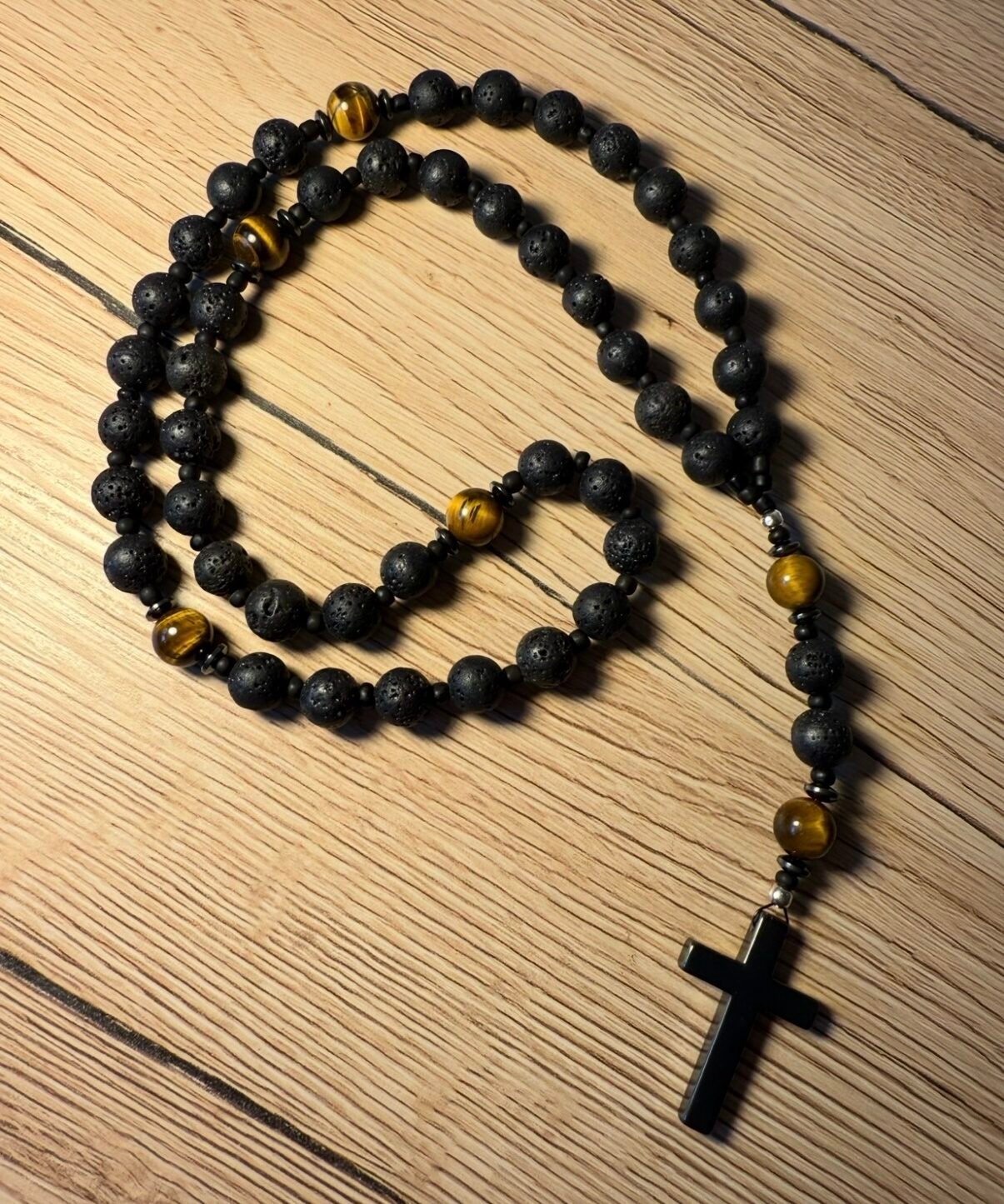 Stilingas vyriškas rožančius iš hematito 8 mm karoliukų ir 10 mm tigro akies – moderni ir prasminga stiliaus detalė šiuolaikiniam vyrui. Tinka nešioti kasdien arba ypatingomis progomis.